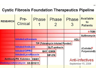 Una formulación liposomal de ciprofloxacina esta también en desarrollo (resumen 401 Bruinenberg y col. Pediatr. Pulmonol 2008 suppl. 31:344) ya se llevo a cabo la fase 1 y se esta realizando la fase 2, todavía faltan estudios para que este a disposición de los pacientes pero son alternativas a los antibióticos inhalados que tenemos hoy en día.