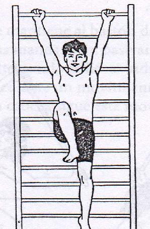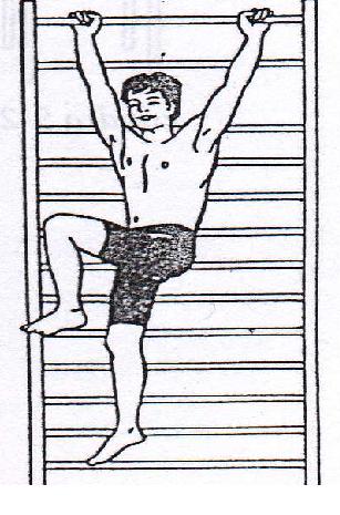 Colgados de la escalera se encoge una pierna y se lleva hacia un lado y luego se hace lo mismo con la otra pierna.