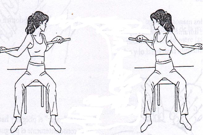 Colocamos el bastón entre los brazos pasando por detrás de la espalda. Las manos colocadas pasivamente sobre el bastón. Alternando se lleva una punta del bastón hacia atrás, lentamente los más lejos posible, mediante un movimiento de giro, primero a un lado y luego al otro. La cabeza sigue este movimiento.